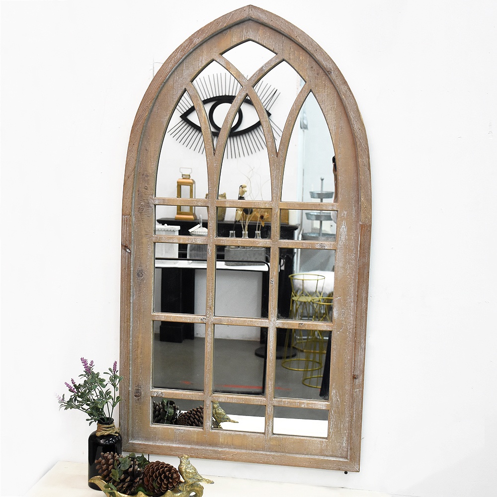 Wooden Arched Window Wall Mirror This large mirror is crafted of solid fir wood with a Brown finish, vintage rustic Farmhouse appeal. Our LUCKYWIND arched window mirror is a great accent piece to any home’s rustic decor.