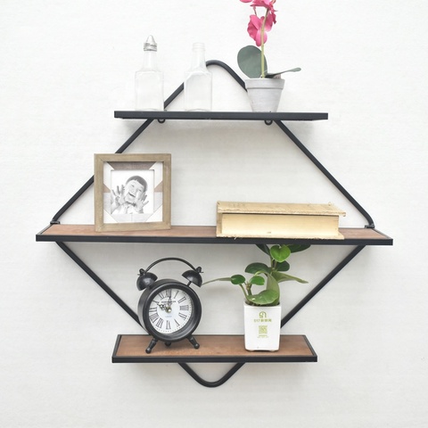 Diamantvormige 3- Tiers Opvouwbare Ijzeren Wandplank Woonkamer, Huisdecoratie Houten Bord Metalen Frame Muur Display Drijvende Plank