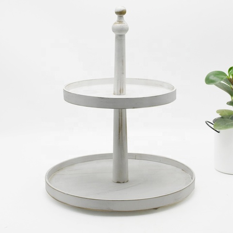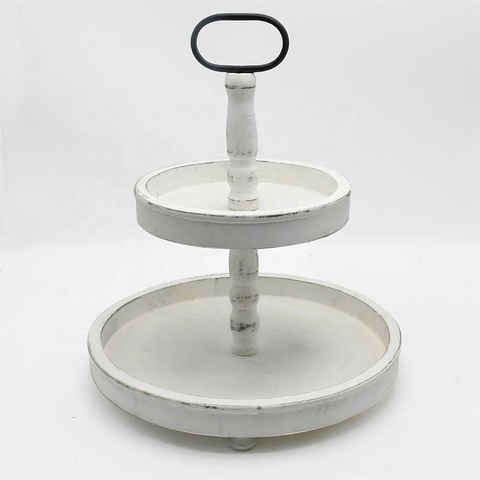 Kreatives Distressed weißes Holz-Metallgriff 2-Stufen-Tablett rustikales Bauernhaus Küche Dekor hölzerner Kuchenständer Aufbewahrung Serviertablett