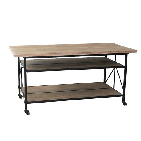 Grande table à manger industrielle vintage en bois et métal avec roulettes pour meubles de salle à manger